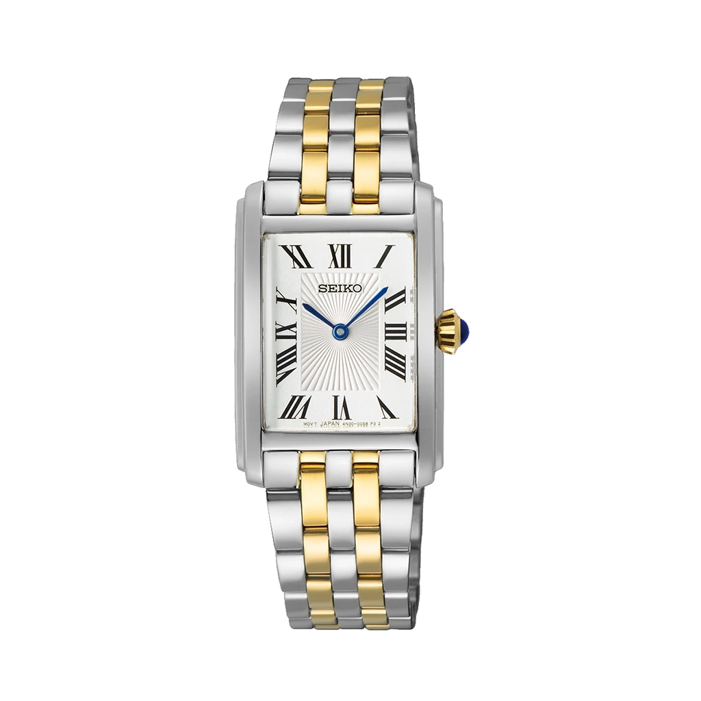 Seiko 33,1x22,2 mm armbåndsur til dame med hvit skive og stållenke med gulldetaljer. Klokken drives av et quartzverk med opptil 3 års batteritid. Vanntett ned 50 meter.