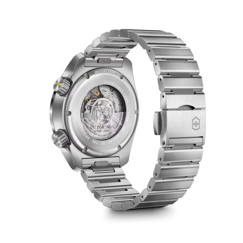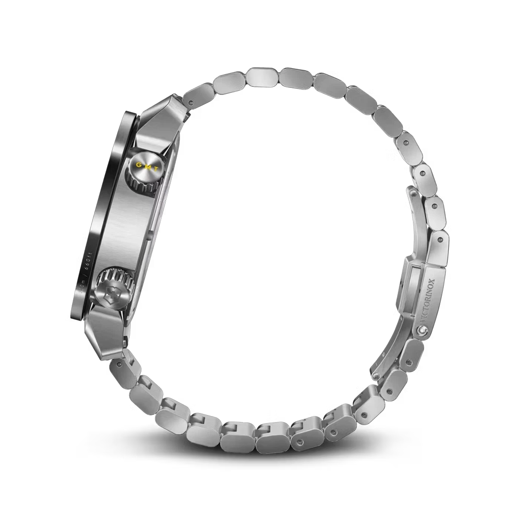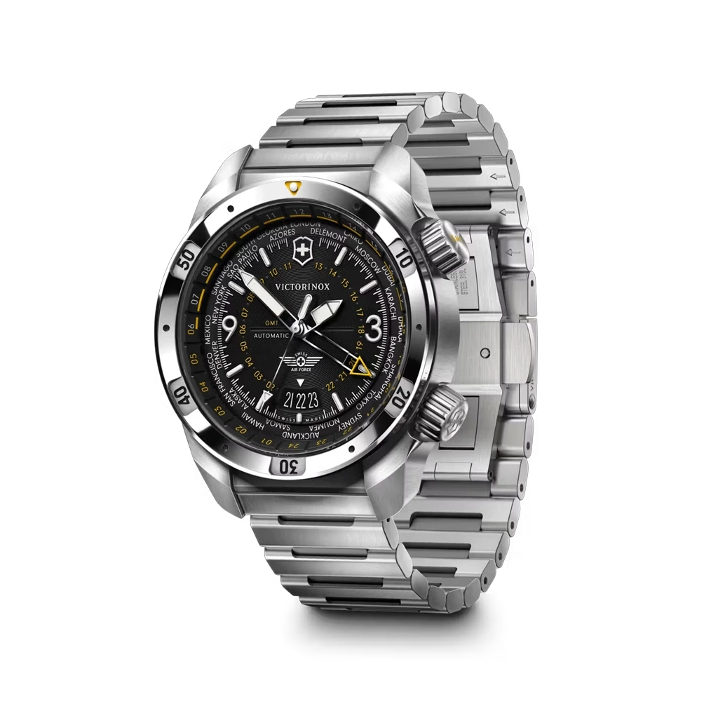 Victorinox Air Pro GMT Automatic herreklokke på 43 mm med sort skive og kasse og lenke i stål.
