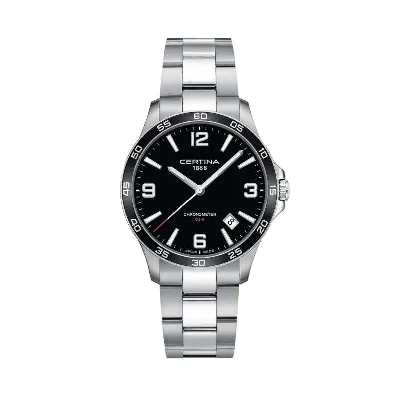 Certina DS-8 41,5 mm armbåndsur til herre med sort skive og hvite visere som presenteres på en stållenke. Klokken har safirglass med antireflekterende belegg og Super-LumiNova. Drives av et quartz-verk og er vanntett ned til 100 meter.