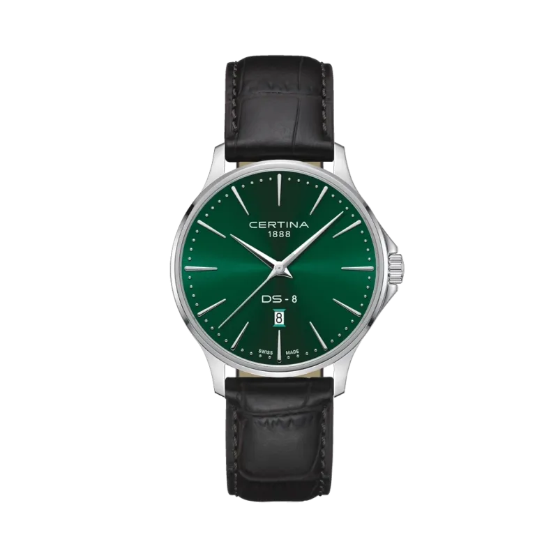 DS-8 Gent 40 mm quartzklokke har et rent, minimalistisk design som legemliggjør tidløs eleganse. kasse i stål og mørk skinnrem utfyller den sømløst ethvert antrekk, noe som gjør det til et ideelt hverdagstilbehør. Den grønne skiven har dato kl 6. 100 meter vanntett.
